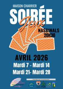 | 27 | 28Soirée Jeux à la Maison ParoissialeSoirée Jeux à la Maison ParoissialeHeure/min: 20h30 - 23h00